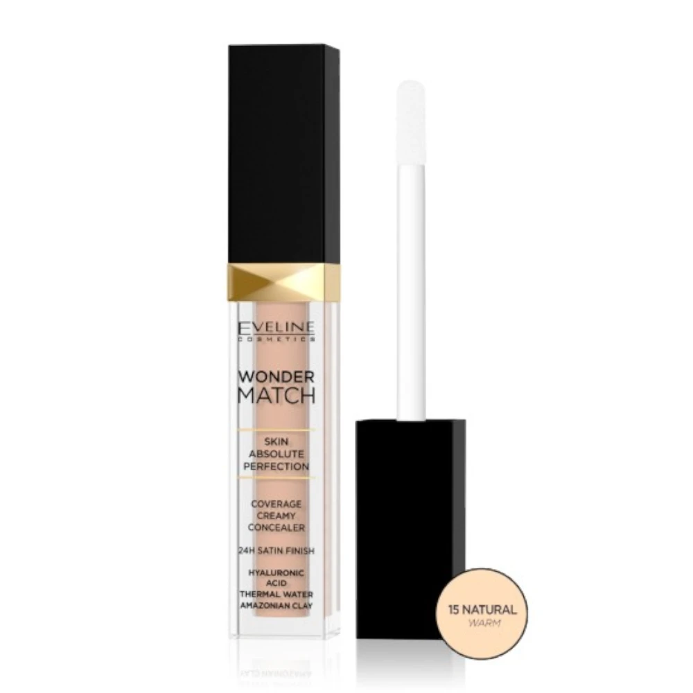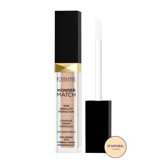 Corector Eveline Wonder match (Natural 15) combină ingrediente de îngrijire precum acidul hialuronic, apa termală și nămolul amazonian. Acestea netezesc și hidratează pielea, oferindu-i un aspect sănătos și radiant.