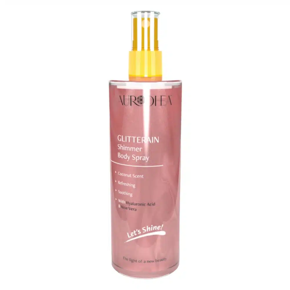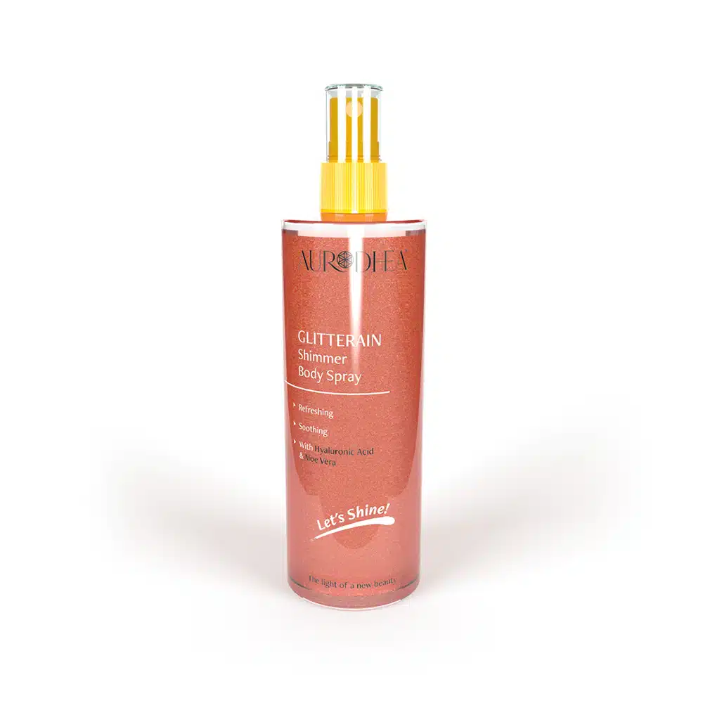 GLITTERAIN de la Aurodhea este un spray strălucitor care conferă pielii un strop de sclipici și un parfum irezistibil.